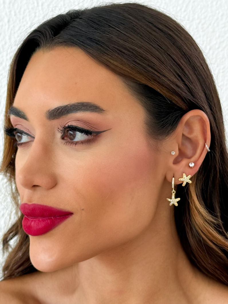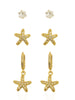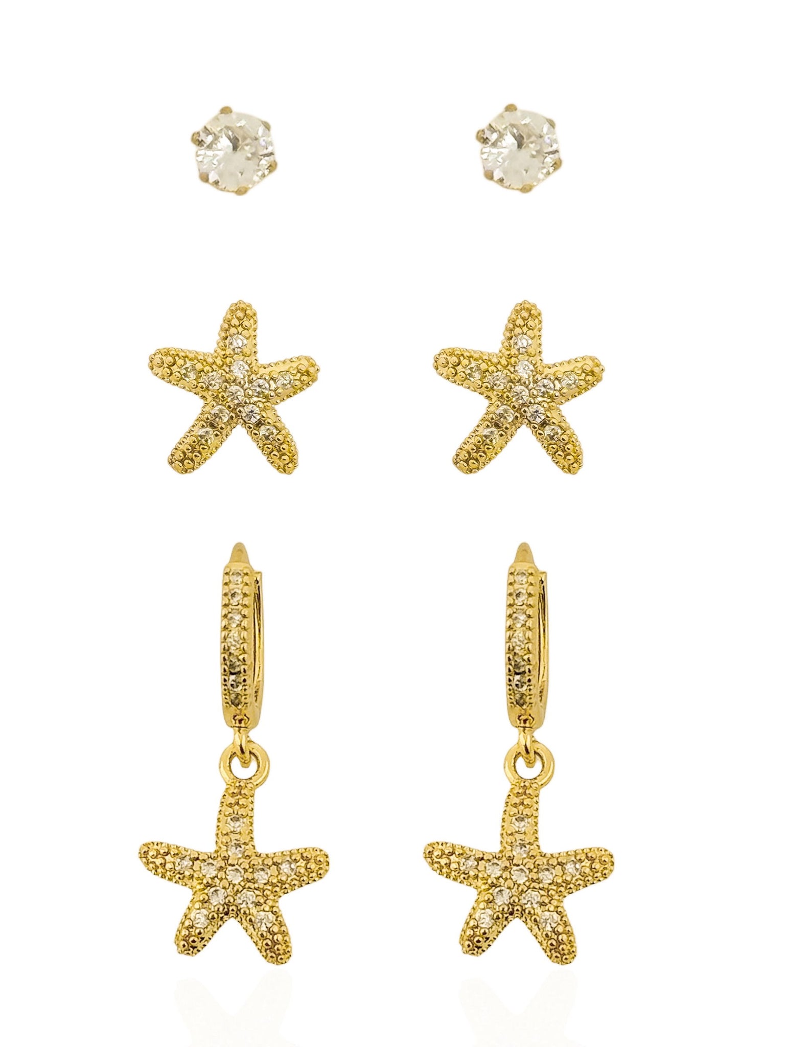 Dê um mergulho de estilo com este trio de brincos encantadores! Com o design delicado de estrela do mar e o brilho intenso das pedras cravejadas, eles trazem um toque lúdico e sofisticado para qualquer produção. A combinação perfeita de banho em ouro 18k e prata garante versatilidade para o seu dia a dia. São leves, confortáveis e ideais para quem ama acessórios que contam uma história. Adicione esse brilho oceânico ao seu porta-joias e arrase no visual!
