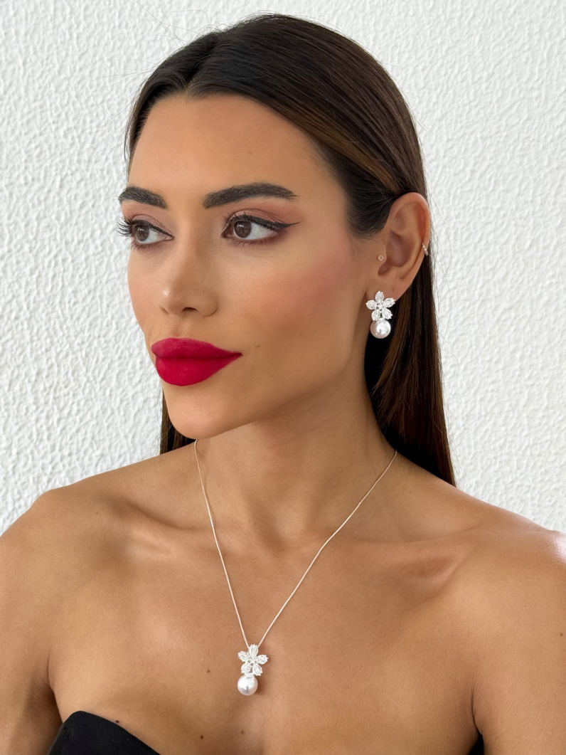 Encante-se com este conjunto de colar e brincos, delicadamente desenhado com uma flor cravejada e uma pérola clássica. O banho de 20 milésimos de prata 925 garante aquele brilho intenso que a gente ama, com um acabamento impecável. Pensando no seu conforto, aplicamos um tratamento antialérgico direto no banho, ideal para peles sensíveis. A dupla camada de verniz protetor protege contra oxidação e desgaste, mantendo suas peças com cara de novas por muito mais tempo. É a escolha perfeita para adicionar um toque de elegância e sofisticação a qualquer look do seu dia a dia. Sinta-se radiante e confiante com este detalhe especial que valoriza sua beleza natural.