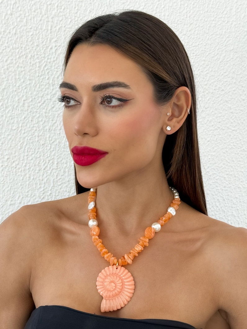 Colar de Pérolas com Pedras e Pingente Concha Laranja